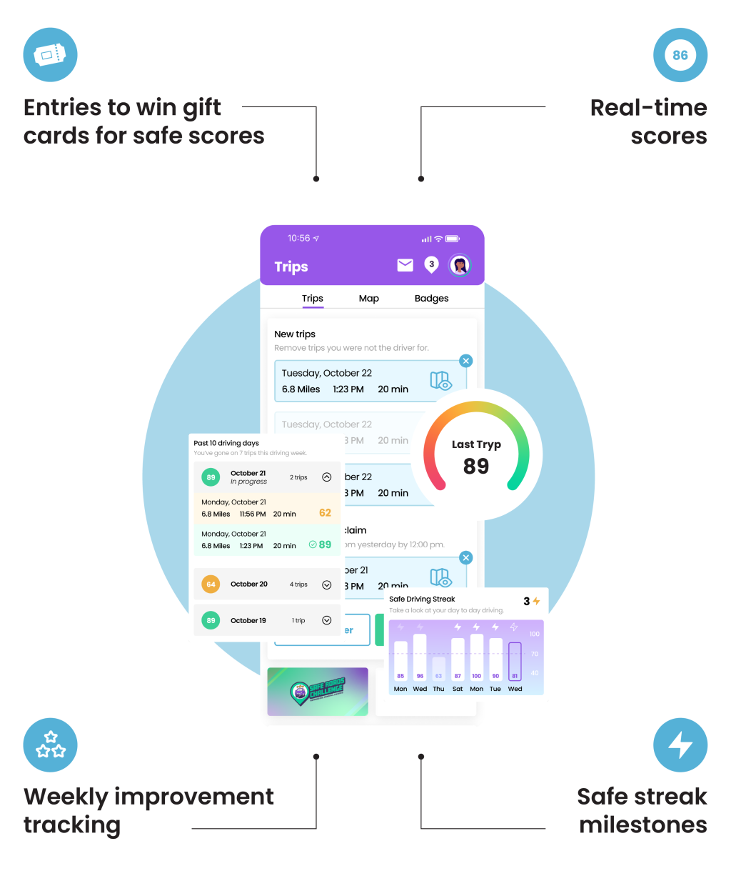 Every trip you take is a chance to earn rewards, build streaks, and improve your skills behind the wheel. The Safe Roads Challenge app tracks how you drive and gives you a score after every trip.